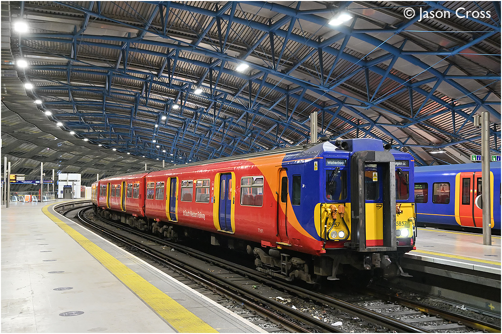5857 waits to depart from London Waterloo with 2O73 2303 London Waterloo to London Waterloo via Kingston. Date: 6 November 2021 Manipulation Notes: None