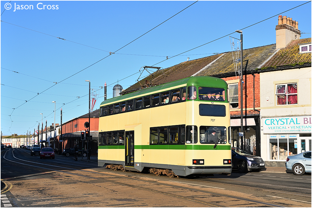 Millennium Car 707 on North Albert Street in Fleetwood with a Fleetwood Ferry to Pleasure Beach heritage tram tour. Date: 13 November 2021 Manipulation Notes: None