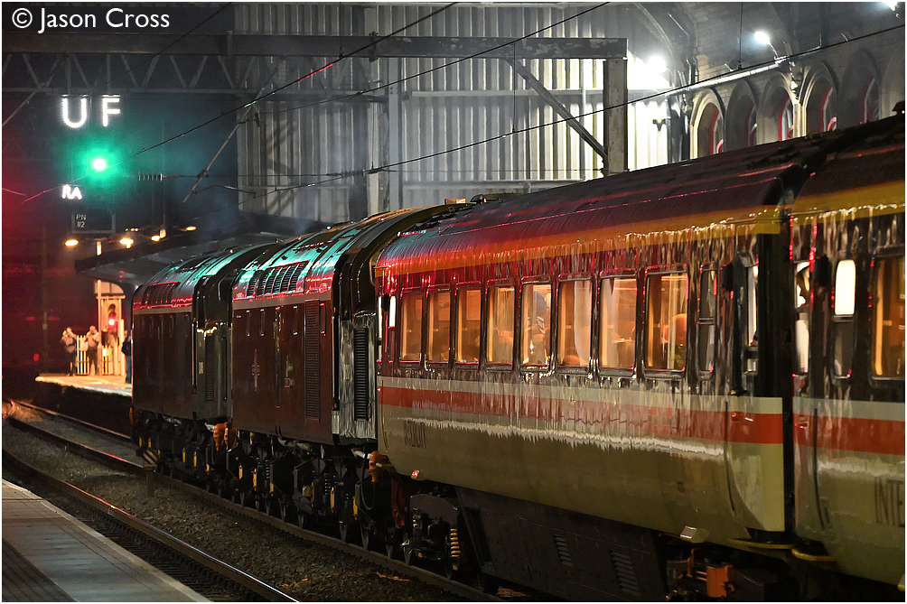 Class 40s D345 and D213 erupt as they depart from Preston with a 1Z33 1703 Edinburgh to Crewe railtour. Date: 13 November 2021 Manipulation Notes: None