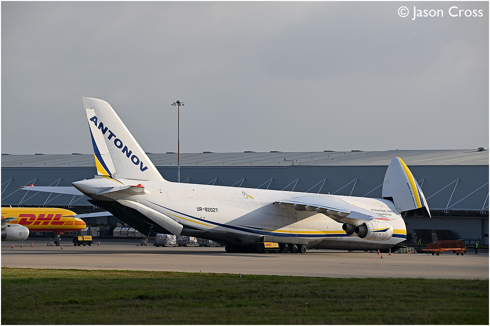 Antonov An124 UR-82027 being unloaded at the DHL hub prior to departing empty to Leipzig. Date: 14 November 2021 Manipulation Notes: None