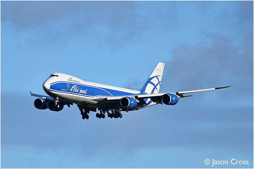 AirBridgeCargo Boeing 747 VQ-BRJ on final approach to runway 27 at East Midlands Airport with a cargo flight from Krasnoyarsk. Date: 21 November 2021 Manipulation Notes: None