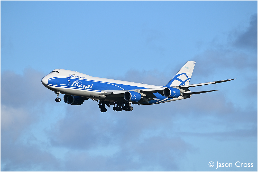 AirBridgeCargo Boeing 747 VQ-BRJ on final approach to runway 27 at East Midlands Airport with a cargo flight from Krasnoyarsk. Date: 21 November 2021 Manipulation Notes: None