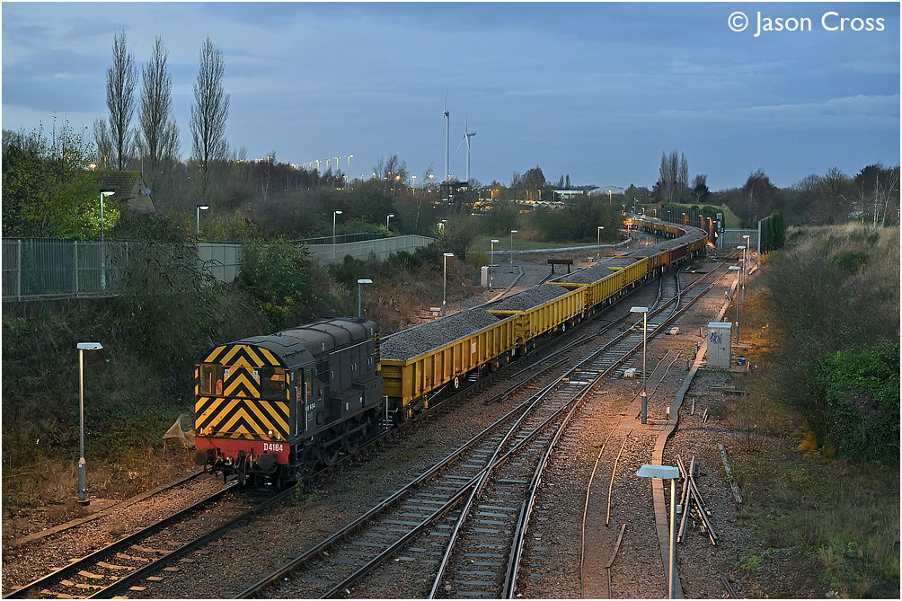 08934 shunting a rake of ballast wagons at Whitemoor Yard. Date: 6 December 2021 Manipulation Notes: None
