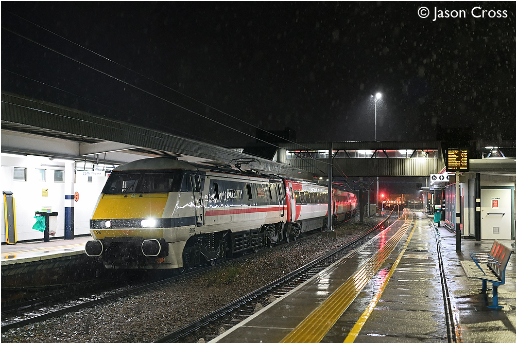 91119 arrives into Peterborough's platform 5 at the head of the 1D33 2133 London King's Cross to Leeds. Date: 9 December 2021 Manipulation Notes: None