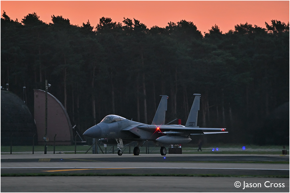 Dawn at RAF Lakenheath. USAF F15C 84-0027 taxiing to runway 24. Date: 10 January 2022 Manipulation Notes: None