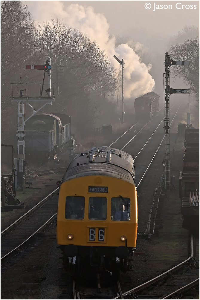 60163 'Tornado' departs from Quorn & Woodhouse with a van train in tow as 3-car class 101 DMU 50203+59506+50266 arrives with a service from Rothley. Date: 15 January 2022 Manipulation Notes: None