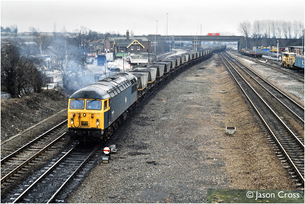 56008 at Sandiacre with a rake of empty MGR coal hoppers. Date: 12 February 1992 Manipulation Notes: None