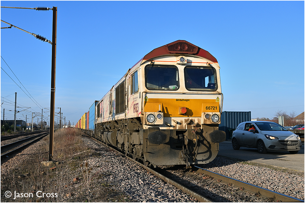 66721 stands in GB Railfreight's Peterborough Yard with the 4L13 1111 Hams Hall to Felixstowe North container train. (Picture taken with permission and from a position of safety). Date: 26 January 2022 Manipulation Notes: None