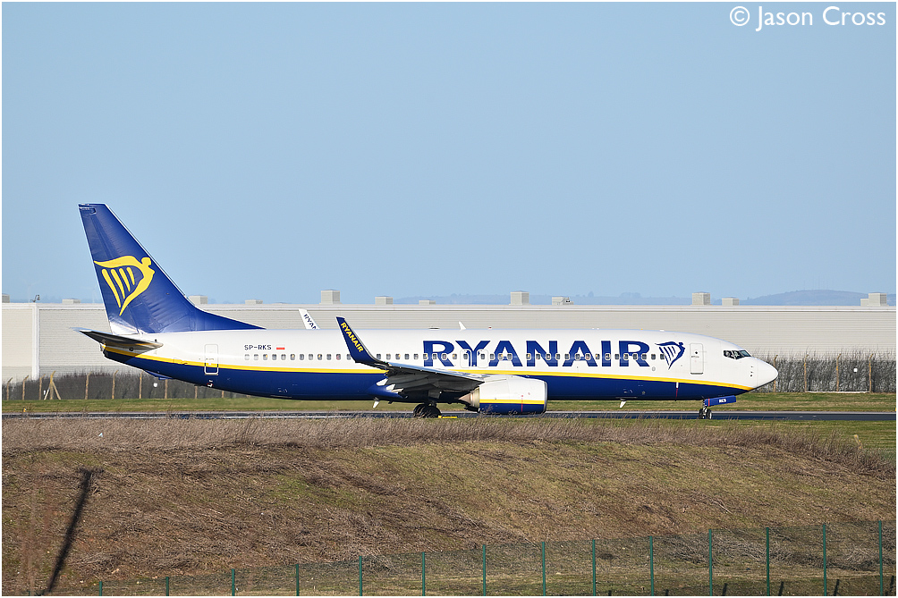Ryanair Boeing 737 SP-RKS taxies down the runway at East Midlands Airport with a flight for Budapest. Date: 31 January 2022 Manipulation Notes: None