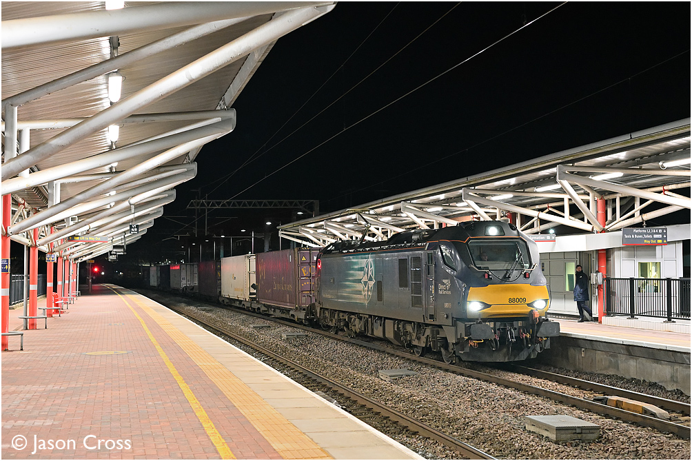 88009 crawls through Rugby at the head of the 4L10 1332 Coatbridge to Tilbury intermodal train. Date: 4 February 2022 Manipulation Notes: None
