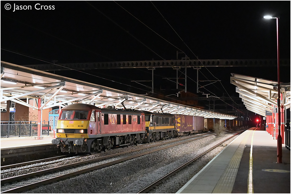 90019 and 90026 pass through Rugby with the 4S49 2158 Daventry to Grangemouth intermodal train. Date: 4 February 2022 Manipulation Notes: None