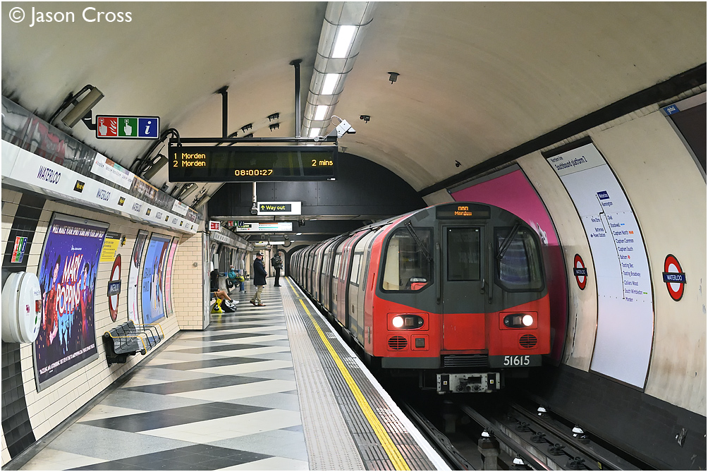 51615 leads a High Barnet to Morden (via Charing Cross) Northern Line service into Waterloo. Date: 27 February 2022 Manipulation Notes: None