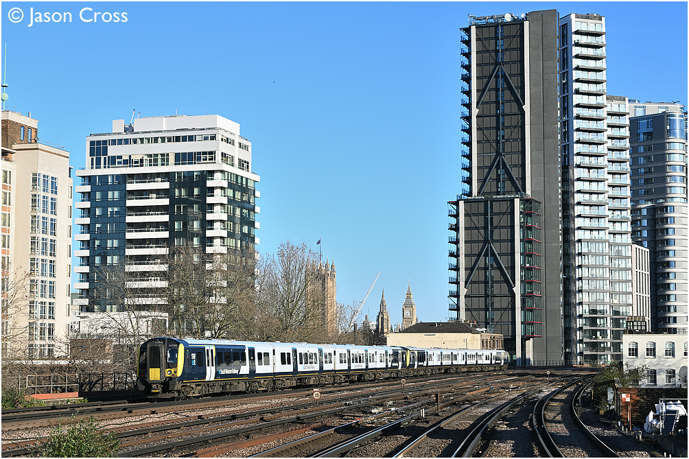450056 and 450119 head away from the camera at Vauxhall with the 1U16 0759 Hounslow to London Waterloo. Date: 27 February 2022 Manipulation Notes: None