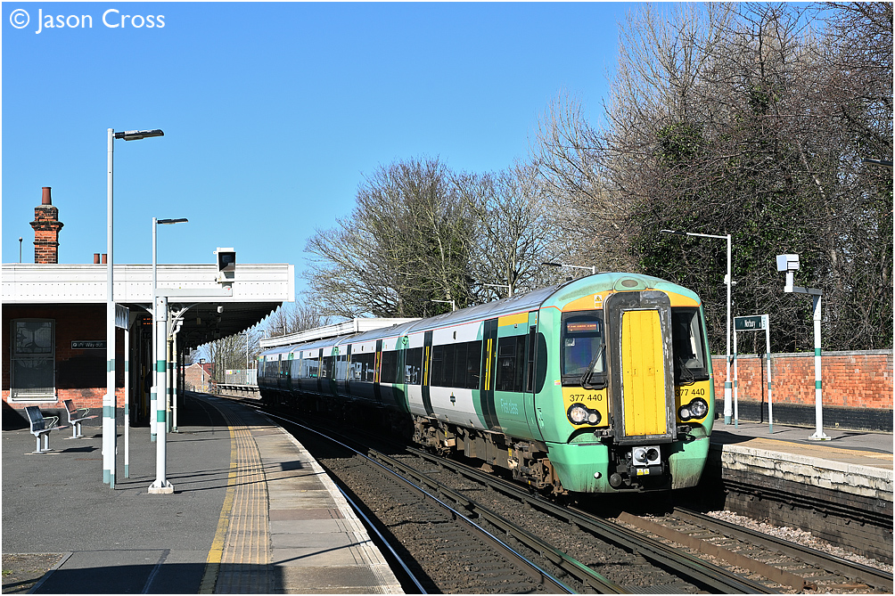 377440 departs from Norbury with the 2B36 1000 London Victoria to Epsom Downs service. Date: 27 February 2022 Manipulation Notes: None