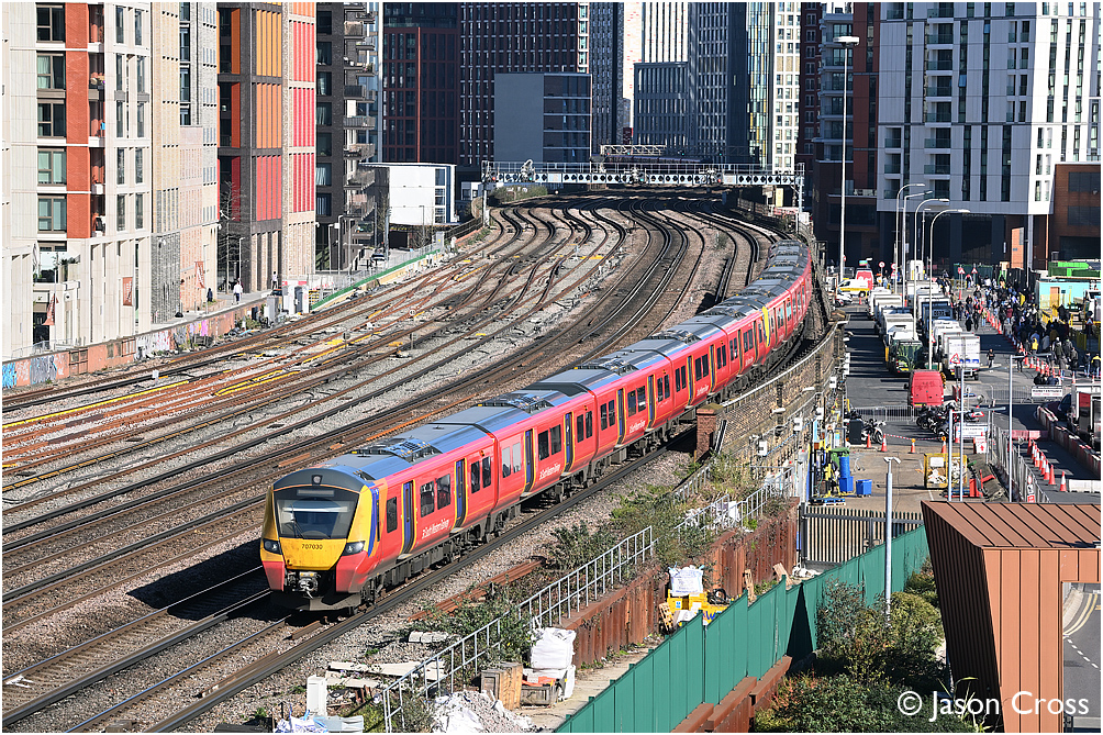 707030 and 707014 pass Nine Elms with the 2H31 1248 London Waterloo to Shepperton. Date: 27 February 2022 Manipulation Notes: None