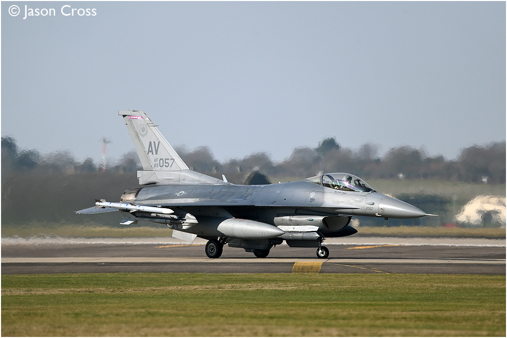 F16C 89-2057 taxies to runway 24 at RAF Lakenheath. (F16s were on a deployment to RAF Lakenheath from Aviano Air Base in Italy). Date: 11 March 2022 Manipulation Notes: None