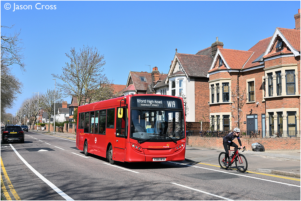1225 catching up with a cyclist on Aldersbrook Road, Aldersbrook with a W19 service for Ilford. Date: 26 March 2022 Manipulation Notes: None