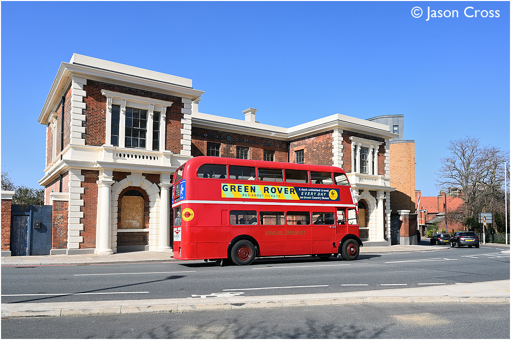 RT4779 on Pier Road and passing the former North Woolwich station building. Route 101 vintage bus running day (organised by the London Bus Museum). Date: 26 March 2022 Manipulation Notes: None