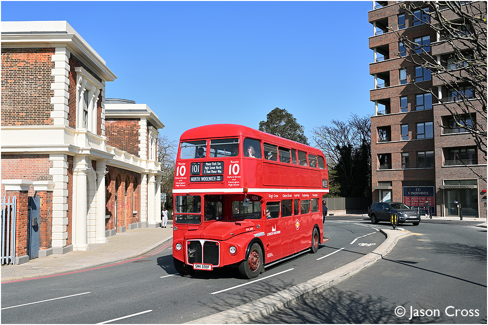 Passing the former North Woolwich station building is RML2699. Route 101 vintage bus running day (organised by the London Bus Museum). Date: 26 March 2022 Manipulation Notes: None