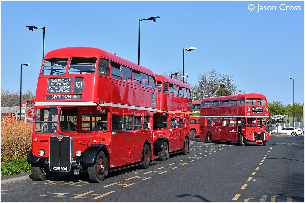RT1658, RT1790 and RML2699 at Beckton Bus Station. Route 101 vintage bus running day (organised by the London Bus Museum). Date: 26 March 2022 Manipulation Notes: None