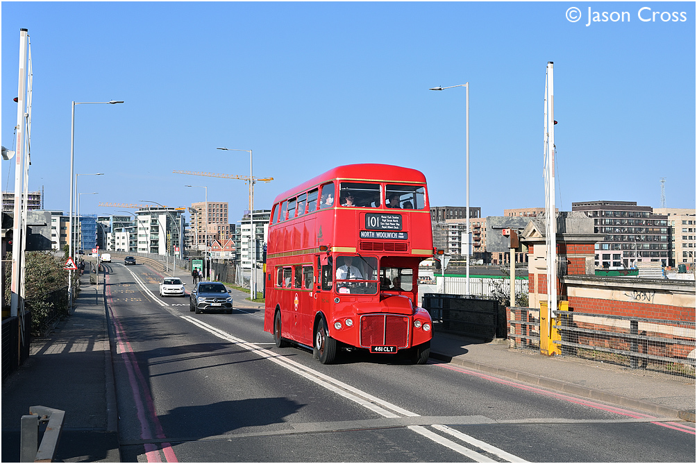 RMC1461 approaches the Bascule Bridge over the King George V Dock on its way to North Woolwich. Route 101 vintage bus running day (organised by the London Bus Museum). Date: 26 March 2022 Manipulation Notes: None