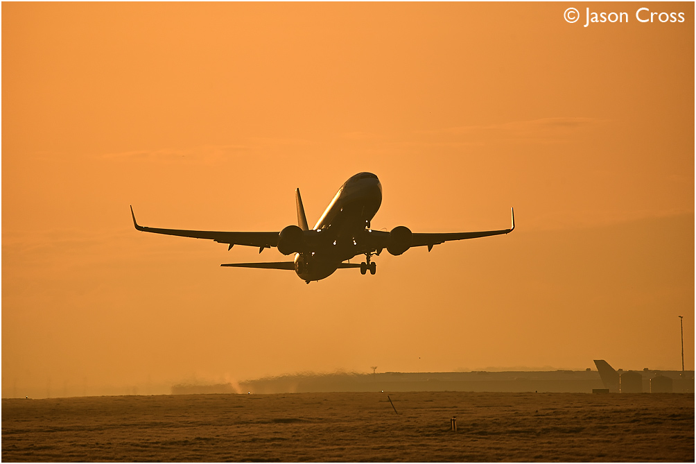Dawn at East Midlands Airport: Ryanair Boeing 737 EI-DHW departing for Malaga. Date: 2 April 2022 Manipulation Notes: None