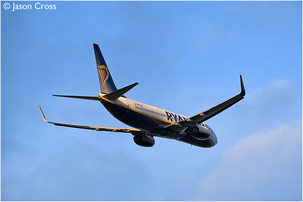 Dawn at East Midlands Airport: Ryanair Boeing 737 EI-DHW departing for Malaga. Date: 2 April 2022 Manipulation Notes: None