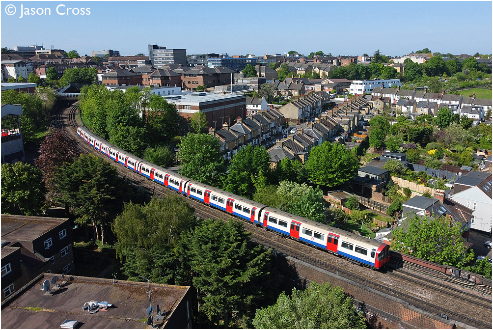 A Cockfosters bound Piccadilly Line service formed of 1973 Tube Stock departs from Southgate. Date: 8 May 2022 Manipulation Notes: None Photo taken from a drone