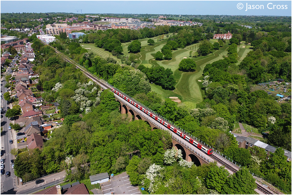 A Mill Hill East to Battersea Power Station Northern Line service crosses the Dollis Brook Viaduct. Date: 8 May 2022 Manipulation Notes: None Photo taken from a drone