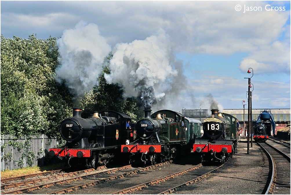 5637, 5553 and 7822 'Foxcote Manor' at Barrow Hill Engine Shed during a Russ Hillier photo charter. Date: 11 July 2003 Manipulation Notes: None