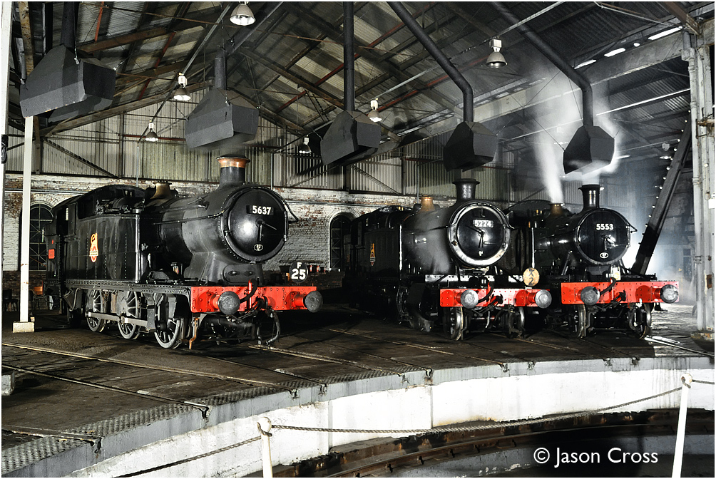 5637, 5224 and 5553 inside Barrow Hill Roundhouse during a Russ Hillier photo charter. Date: 11 July 2003 Manipulation Notes: None