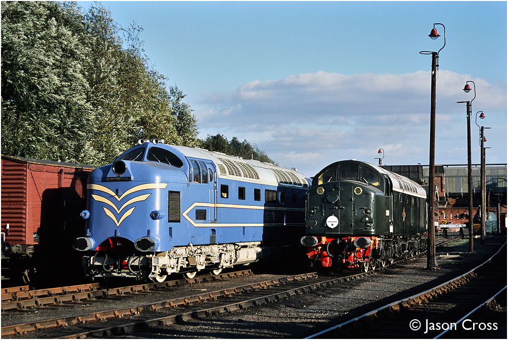 The prototype 'DELTIC' and class 40 D200 strike a 1950's pose in the yard at Barrow Hill Engine Shed during an EMRPS photo charter. Date: 3 October 2003 Manipulation Notes: None