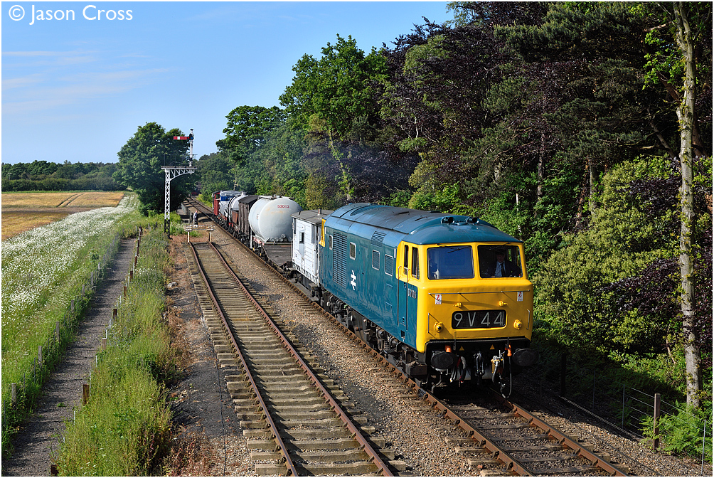'Hymek' D7076 approaching Holt. EMRPS photo charter. Date: 11 June 2015 Manipulation Notes: None Camera mounted on a tall pole and remotely fired