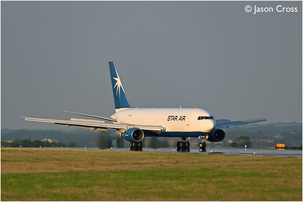Star Air Boeing 767 OY-SRG exits the runway at East Midlands Airport after landing with a cargo flight from Belfast. Date: 21 June 2022 Manipulation Notes: None