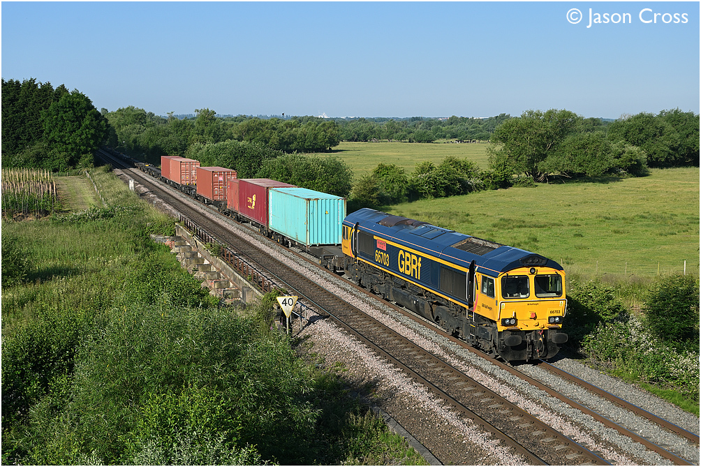 66703 approaches the Syston bypass bridge at the head of a 4L02 0720 Humberstone Road to Felixstowe South container train. Date: 22 June 2022 Manipulation Notes: None