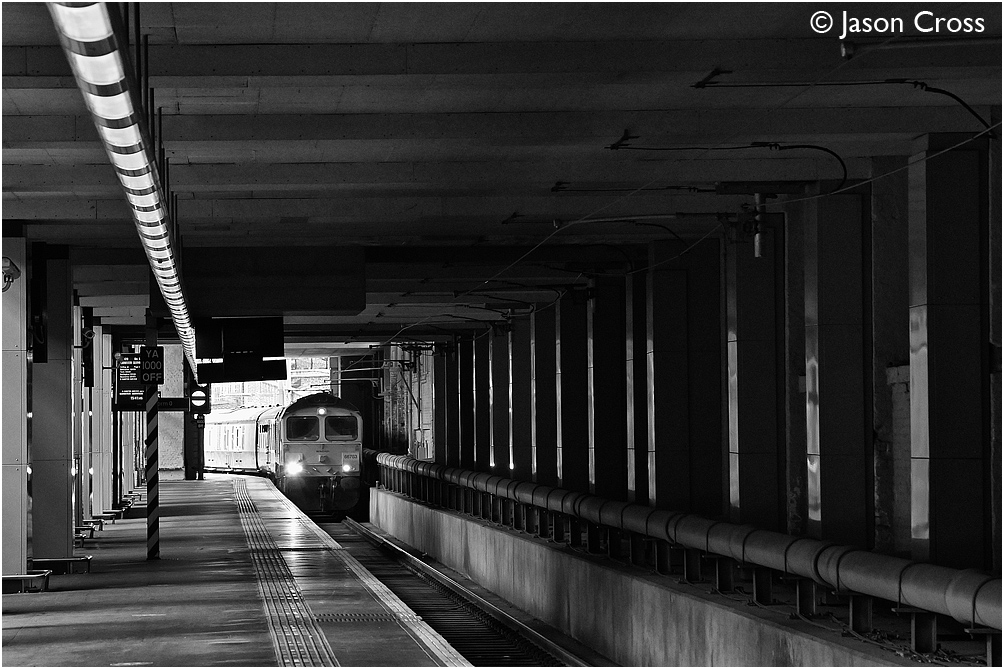 An arty shot of 66763 arriving into platform 0 at London King's Cross with a 5Z92 1510 Ferme Park to London King's Cross ECS. Date: 2 July 2022 Manipulation Notes: None