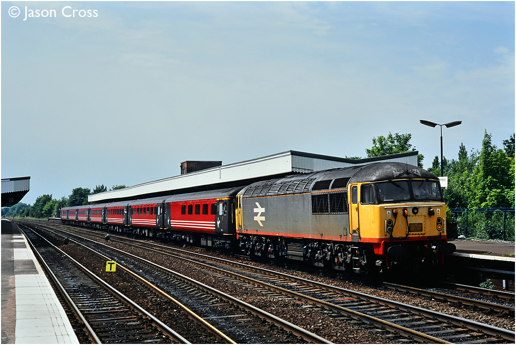 A shortage of Virgin Cross Country locos led to 56019 being hired in to work the 1O38 0910 Edinburgh to Bournemouth and is seen during its station stop at Leamington Spa. Date: 20 June 1998 Manipulation Notes: None