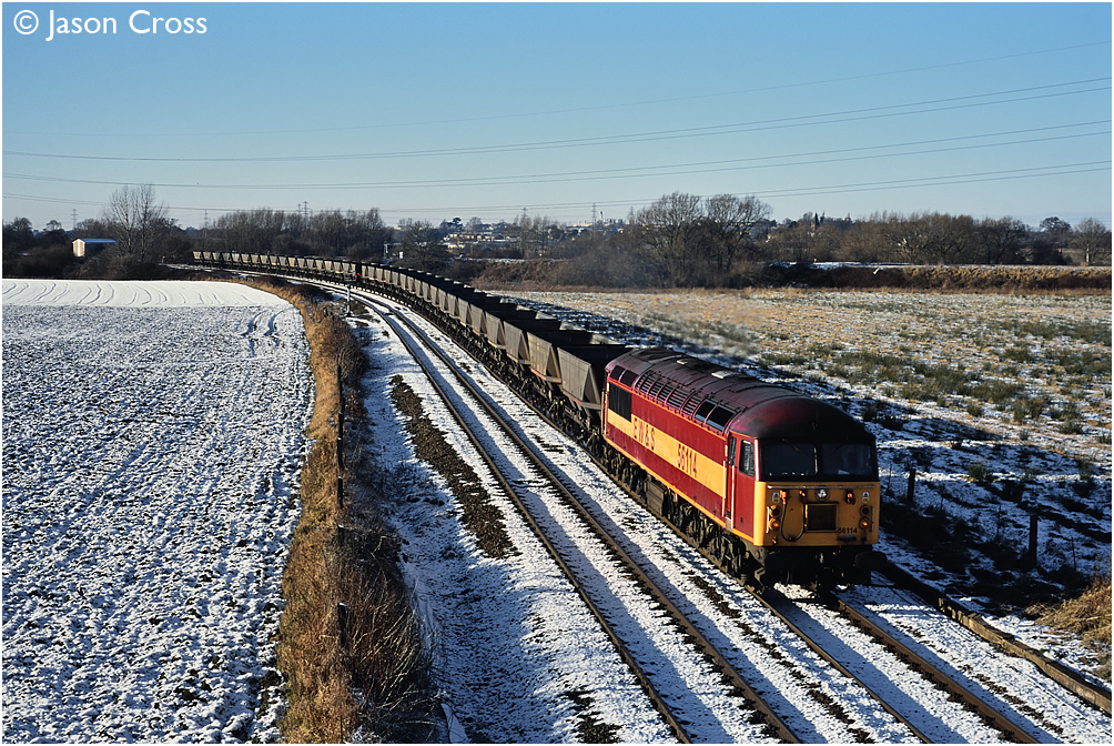 56114 at a wintry looking Stenson with a Drakelow Power Station to Toton Yard train of empty MGR coal hoppers. Date: 31 December 2001 Manipulation Notes: None