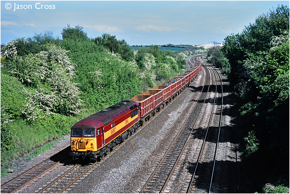 56087 'ABP Port of Hull' approaches Barrow upon Soar with the 6E97 1550 Corby to Aldwarke scrap train. Date: 11 May 2002 Manipulation Notes: None