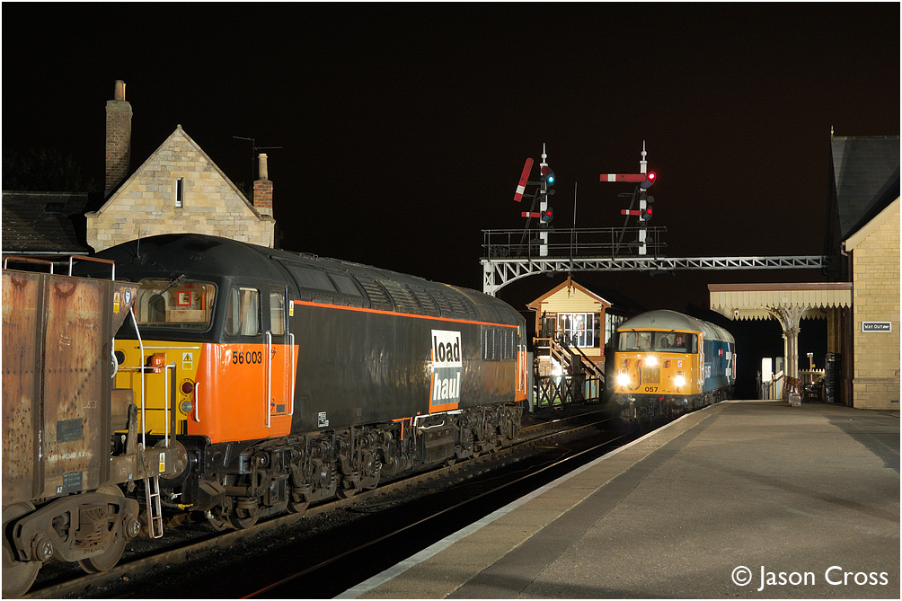 56003 poses with an engineer's train at Wansford as 56057 approaches. EMRPS photo charter. Date: 23 September 2006 Manipulation Notes: None