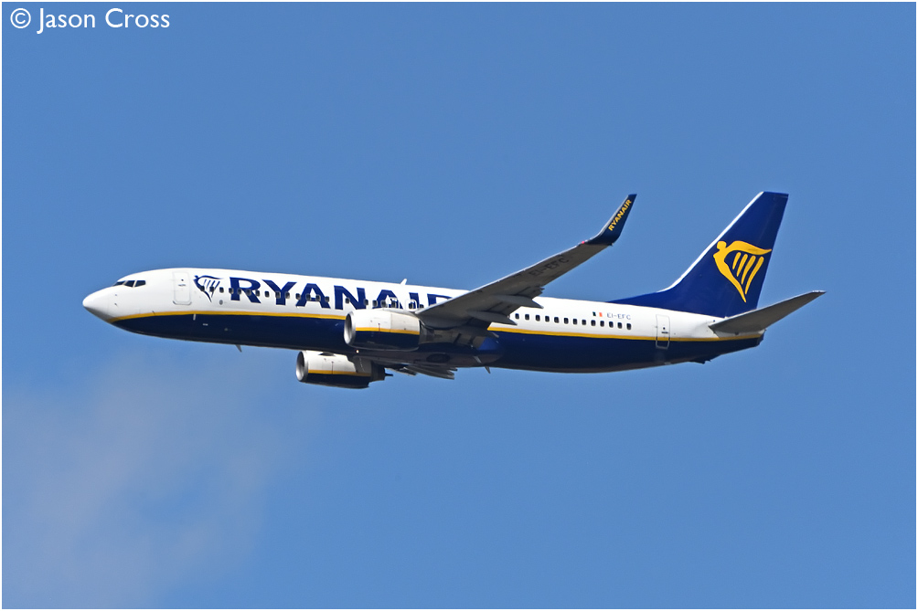 Ryanair Boeing 737 EI-EFC on final approach to East Midlands Airport runway 27 with a flight from Chania. Photo taken from Normanton Hills near East Leake. Date: 3 August 2022 Manipulation Notes: None