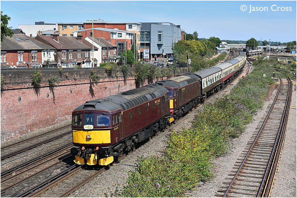 33025 and 33029 power away from Eastliegh with a 1Z33 0545 Burton-on-Trent to Weymouth railtour. Date: 6 August 2022 Manipulation Notes: None