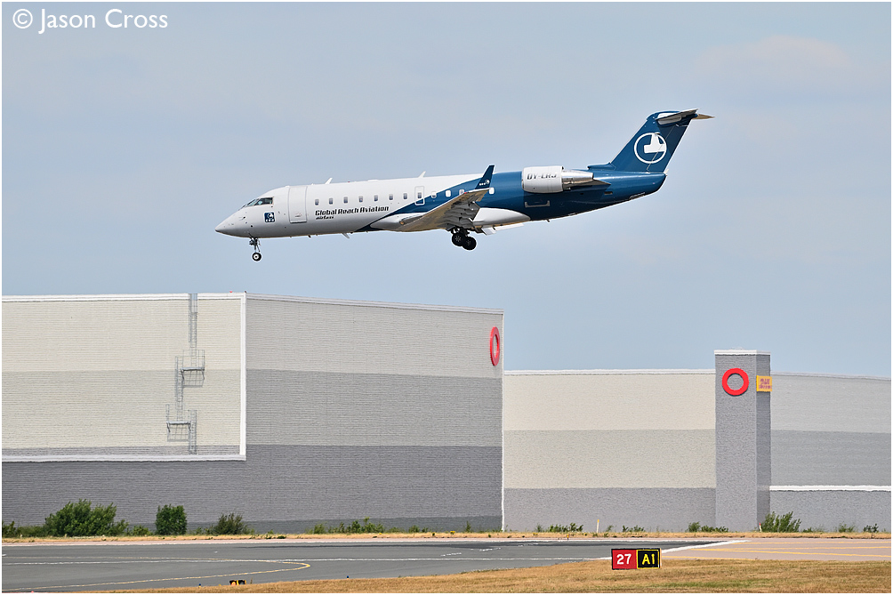 Copenhagen Airtaxi Mitsubishi CRJ-200LR OY-CRJ on final approach to East Midlands Airport runway 27 with a flight from Almeria. Date: 7 August 2022 Manipulation Notes: None