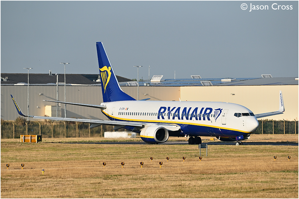 Ryanair Boeing 737 EI-DPK taxiing to runway 27 via the alpha taxiway at East Midlands Airport with a flight for Palma de Mallorca. Date: 9 August 2022 Manipulation Notes: None Camera mounted on a tall pole and remotely fired