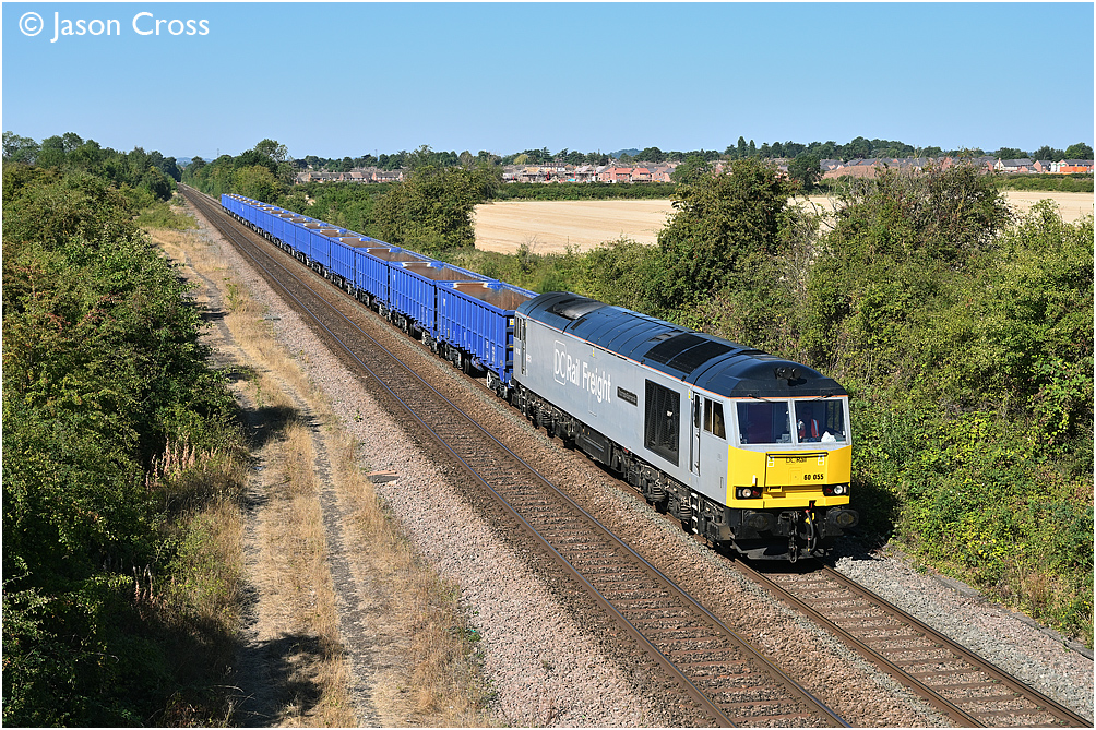 60055 powers away from Radcliffe on Trent with a 6Z91 0915 Chaddesden Sidings to Kings Lynn train of sand empties. Date: 12 August 2022 Manipulation Notes: None