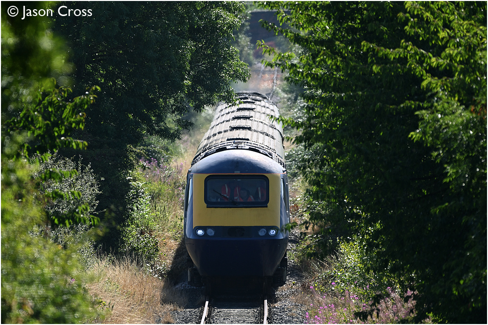 43159 and 43048 approach Asfordby ground frame with a 5Z43 Butterley to Asfordby Test Centre (RIDC Melton) stock move. Date: 26 August 2022 Manipulation Notes: None