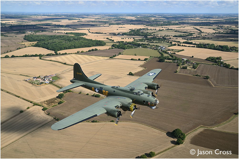 Ex-USAAF, Boeing B17 'Flying Fortress, 44-85784 (G-BEDF) - Ashdon House and Langley Wood (upper left of shot). Centre of Aviation Photography (COAP) Air to Air sortie. Date: 28 August 2022 Manipulation Notes: None