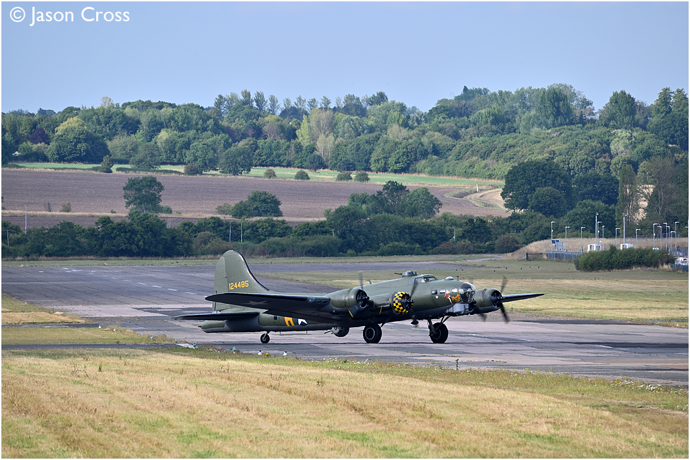 Ex-USAAF, Boeing B17 'Flying Fortress, 44-85784 (G-BEDF) taxiing out to runway 02 at North Weald airfield. Date: 28 August 2022 Manipulation Notes: None