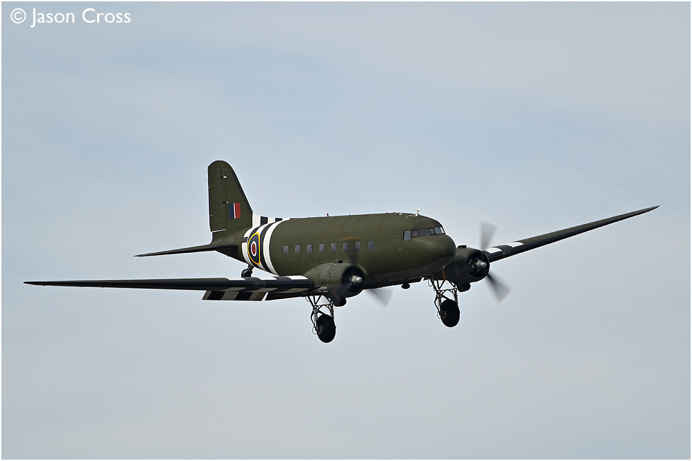 Ex-RAF Douglas C47 KP220 gear down and on final approach to runway 19. The Victory Show 2022, Cosby, Leicestershire. Date: 4 September 2022 Manipulation Notes: None