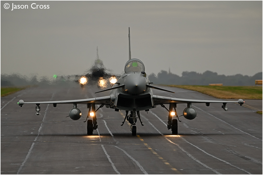 As the rain begins, Typhoon MM7298 of the Italian Air Force (Aeronautica Militare) taxies out to runway 20 at RAF Waddington. Exercise Cobra Warrior. Date: 12 September 2022 Manipulation Notes: None